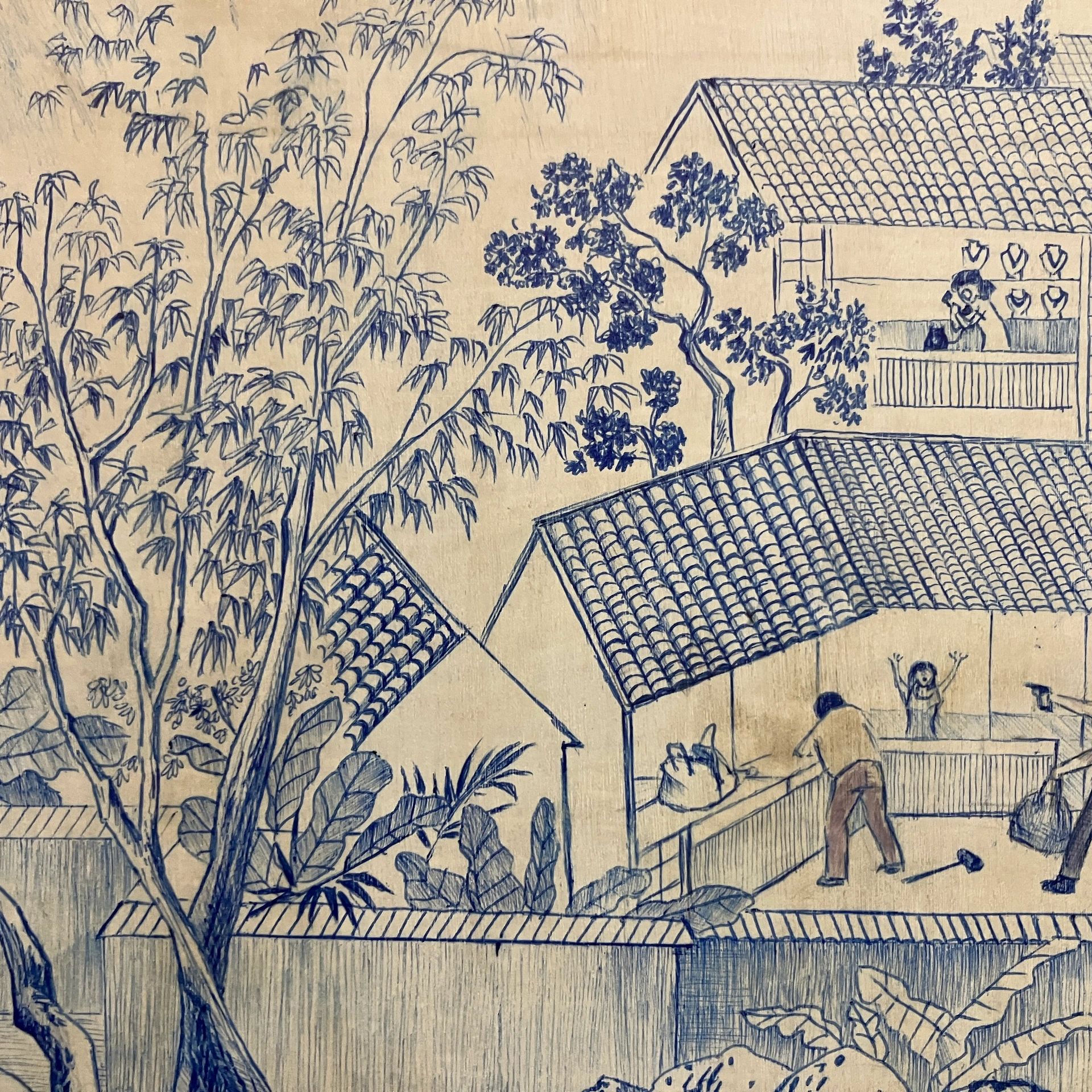 The artwork is executed using ballpoint pen on wooden panels, presented in the format of a horizontal triptych. It appropriates compositional strategies and multiple-perspective elements from traditional Chinese ink landscape painting, inviting the viewer on a visual journey through its depicted scenery. The spatial arrangement references the scroll format of "Travelers Among Mountains and Streams" (金碧峰圖卷) by Northern Song dynasty painter Fan Kuan (范寛). By employing these altered tools and materials, the artist aims to disrupt the conventional dichotomy between playfulness and elegance, while simultaneously bridging cultural, geographical, and temporal divides.